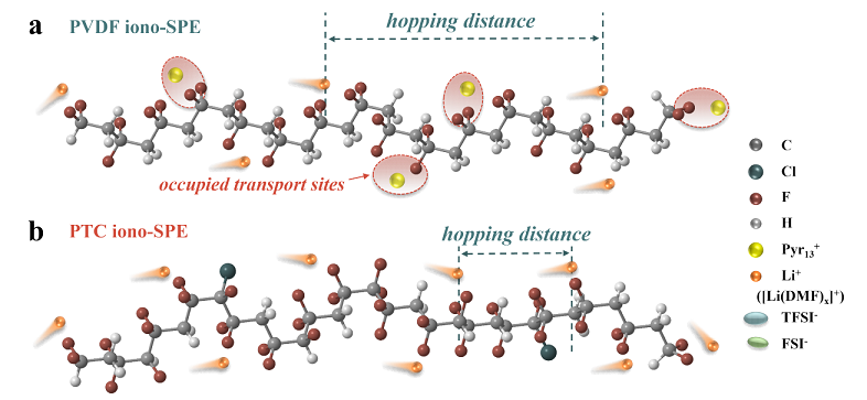 图1.(a)PVDF iono-SPE和(b)PTC iono-SPE的离子传输模型图。