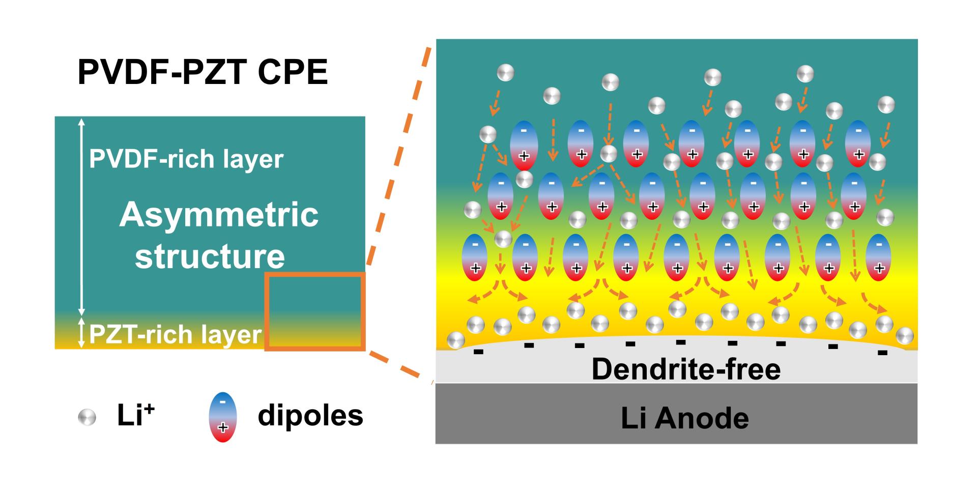 An asymmetric composite solid-state electrolyte consisting of poly(vinylidene fluoride) (PVDF) and PbZrxTi1-xO3 (PZT) is prepared. In this design, the PZT with a high dielectric constant is positioned on the anode side to facilitate lithium-ions transport through dipolar channels, thereby promoting uniform lithium plating and inhibiting dendrites growth.