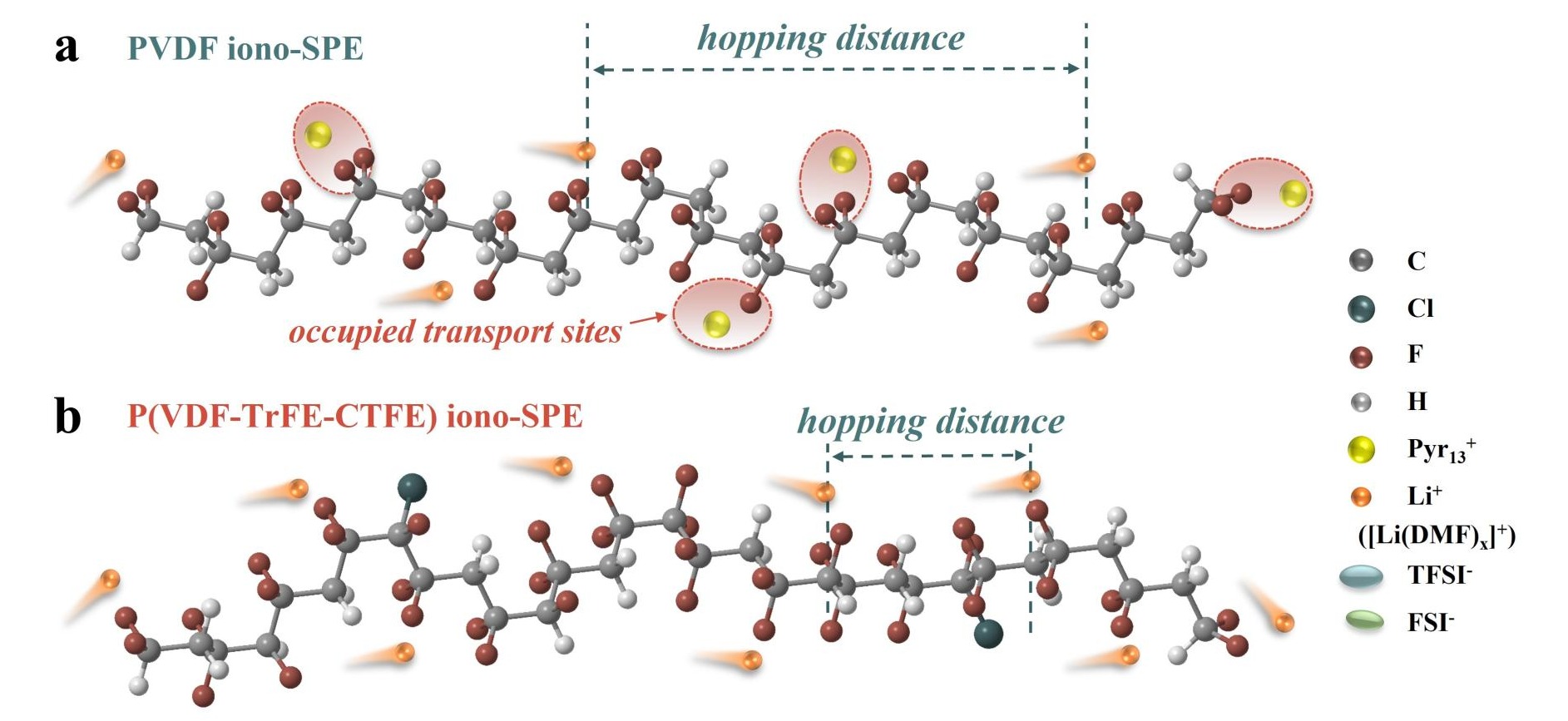 Through conformational regulation of the high dielectric P(VDF-TrFE-CTFE), an all-trans conformation with all F atoms located on one side of the chain is achieved, which constructs ion hopping highways and results in a high lithium-ion transference number of 0.61. Both the Li//Li symmetric cells and the high-voltage NCM811//Li cells show long-term cycling stablity at 25 oC.