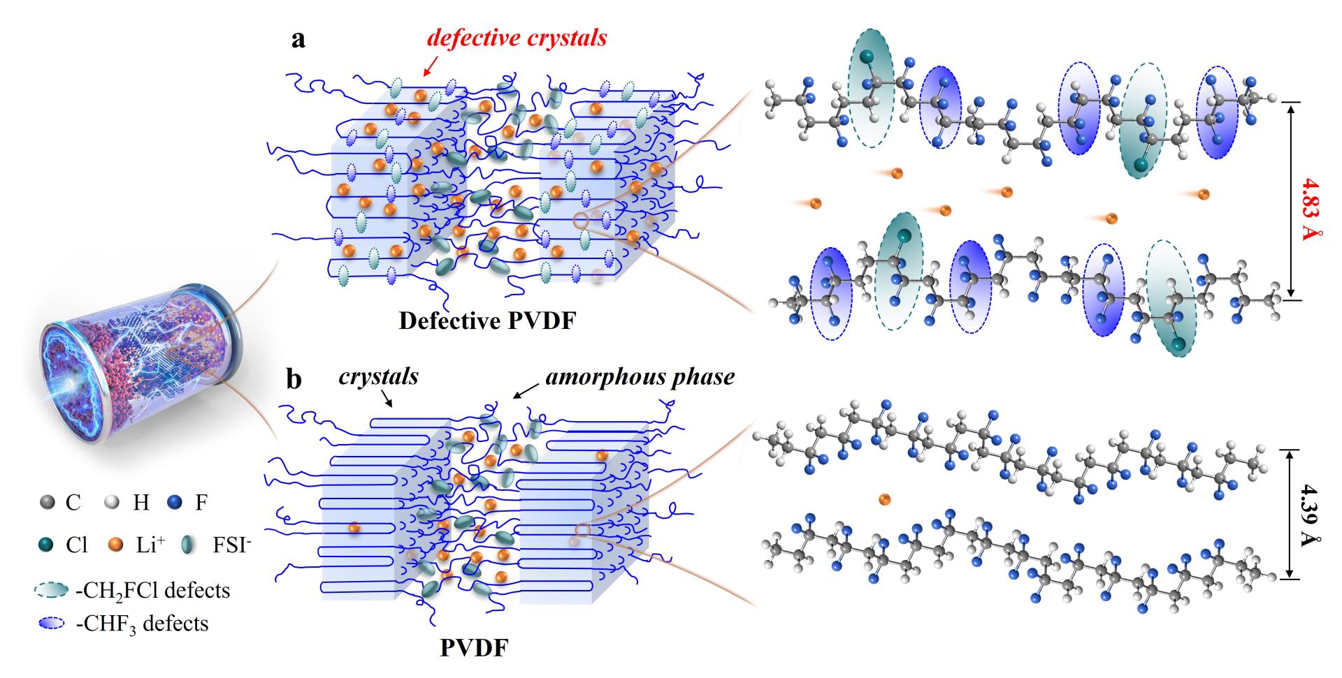 Introducing dipolar defects into PVDF crystals increased interchain spacing and weakened the intermolecular interactions. This triggers a concomitant migration of Li+ through ion-dipole interactions and transforms the ion-insulated crystals of PVDF into fast-ion conductors.
